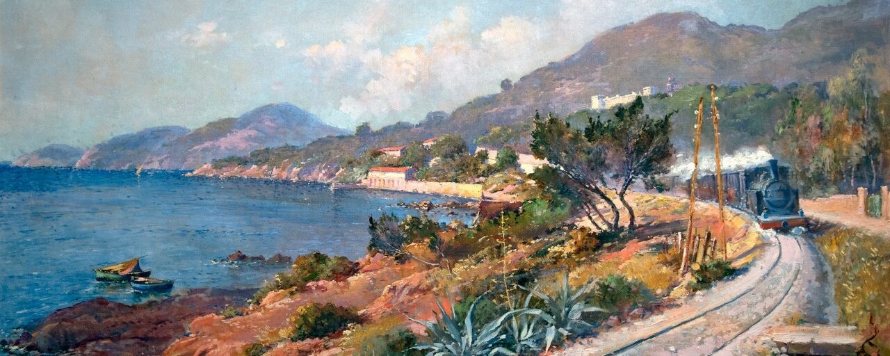 Le Tortillard, dit Le Macaron, chemin de fer du littoral vers San Salvadour. Tableau de Paul Levéré. / La Banque, musée des Cultures et du Paysage.