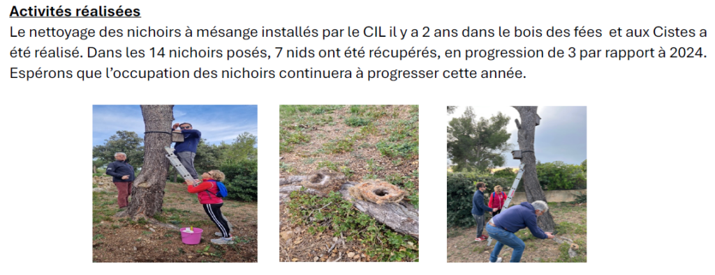 Un de nos membres a eu le plaisir de constater qu’une Mésange charbonnière a adopté un nichoir récemment posé dans le Bois des Fées. Bravo à notre groupe d’installateurs pour l’implantation adéquate donc, et soyons attentifs à ces habitats lors de nos balades dans ce bois !